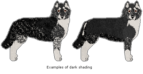 In dogs with Light shading, shading may only be represented as tipping, not solid colour. Exceptions are the ears, tailtip and as a stripe along the spine, which may be solid in colour.