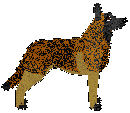 | A liver brindle with white in the piebald pattern and a standard mask in the matching liver pigment | A blue brindle with white in the irish spotting (relaxed) pattern and a standard mask in the matching blue pigment. Also note that this dog features etching - this is where a thin line of the masking colour is present between the white and the coloured areas in masked dogs. Check individual breed standards to see whether this is acceptable for your dog's breed. | A black brindle with white in the piebald pattern and a standard mask in the matching black pigment. Also note that this dog features etching - this is where a thin line of the masking colour is present between the white and the coloured areas in masked dogs. Check individual breed standards to see whether this is acceptable for your dog's breed. |