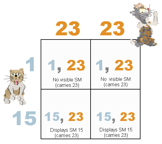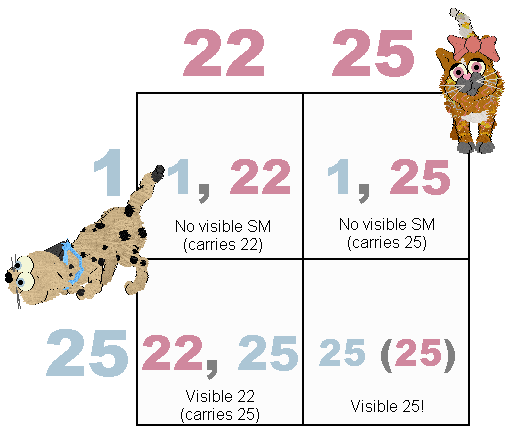 If I bred Prodigy [1,15] with Esnina [23, 23] their kittens could inherit any combination of SM genes from their parents (in this case, [1, 23] or [15, 23])