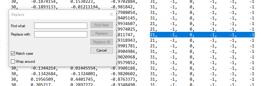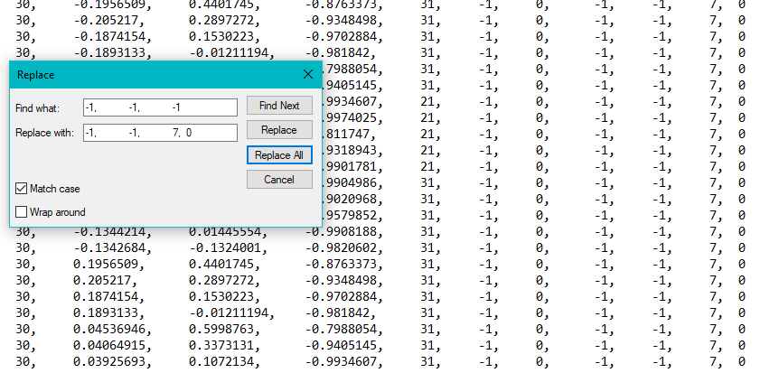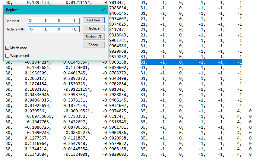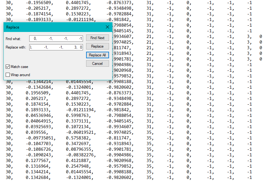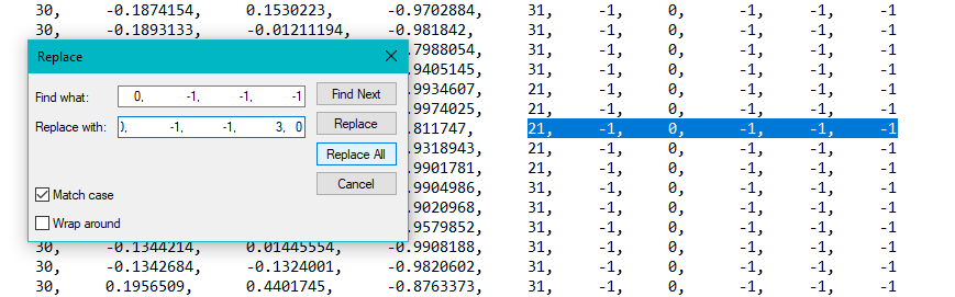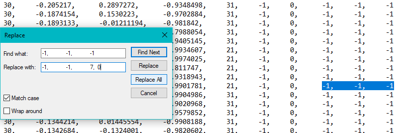 What will NOT work is inputting only -1 and trying to replace that with your texture because it will find and replace ALL the -1s! So before using any sequence, make sure it is unique to the end of the lines you want to change.