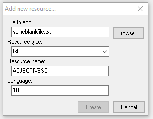 Add a new TXT resource. Select your blank txt file. The rest of the values will be automatically populated.