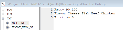 You can use Prism's PetzA to set toy adjectives in LnzPro, without having to use a hex editor. For example you can easily make toys edible, change the flavour of bowls, or change the physics behaviour of objects.