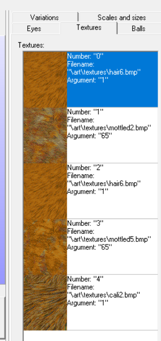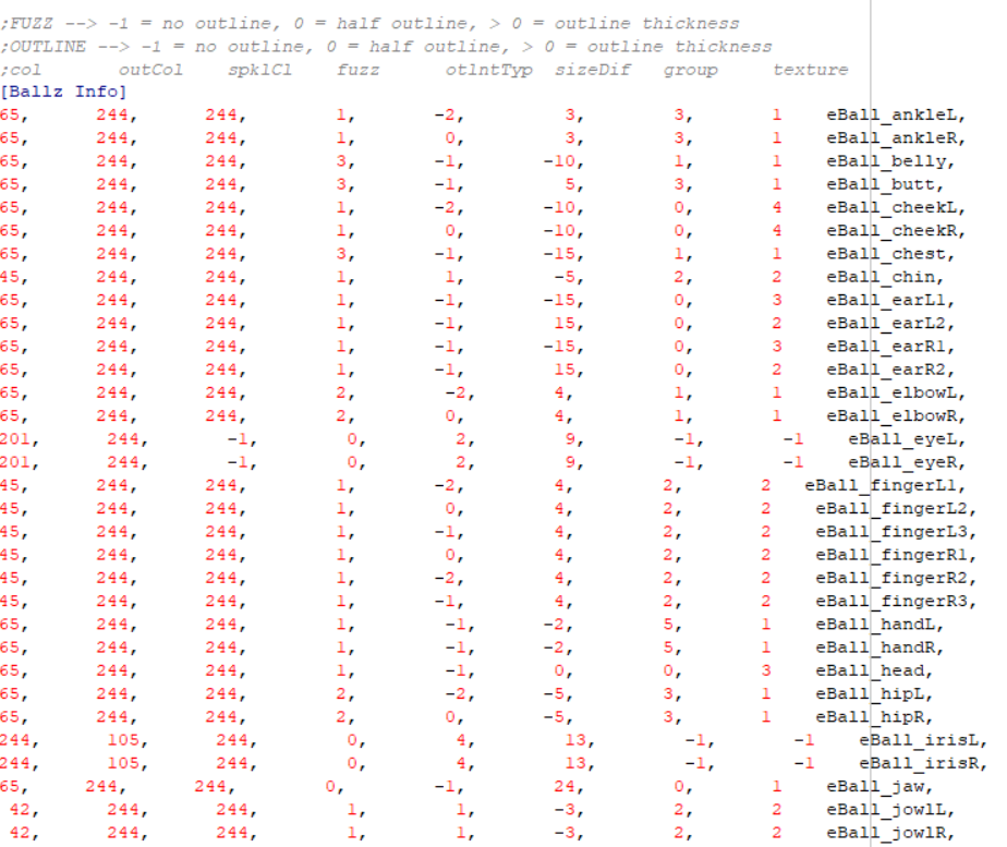 To change the texture of a particular ball, addball, or paintball, you will need to scroll down to that section, locate the relevant ball, and find which column corresponds to texture.