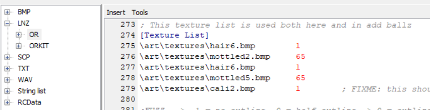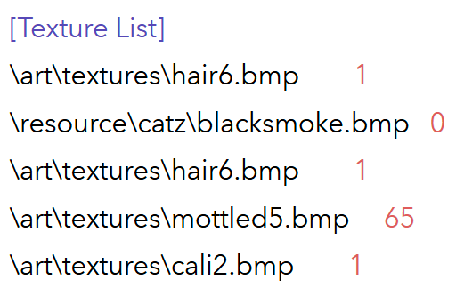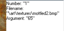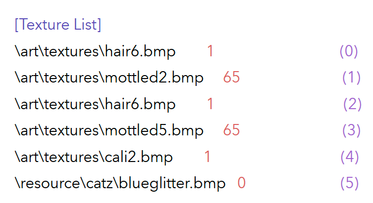 Now if we go back up to our texture list, we'll see that this corresponds to mottled5.bmp . If we want the head ball to use our new blueglitter.bmp texture instead, all we need to do here is change that 3 to a 5!
