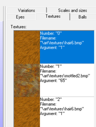 So if we scroll down to the Head ball (labelled in this case but we could simply count down, from 0, to ball 24 if it wasn't) and look across to the last column, which is labelled as the Texture column, we see that the head ball has the texture "3". (Note that "-1" means untextured.)
