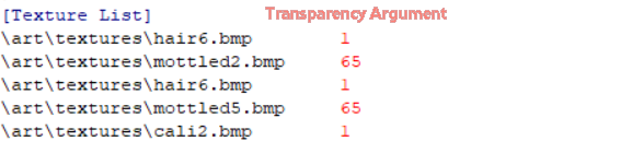 The red numbers to the right of each texture indicate the transparency of the texture.