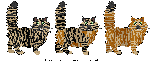 Amber tabbies follow normal Tabby striping guidelines, but their base and stripe colours are exchanged for amber tabby colours. The amount replaced varies, and to make it easier to understand we have split the amber pattern into three categories, called cold amber, lukewarm amber, and warm amber. Any of the varieties may be used.