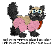 The colourpoint pattern has a tendency to bleach red areas, therefore some additional combinations are allowed in tabby/tortie/torbie points that are not seen in usual tabbies/torties/torbies. Bleaching affects both the points and body, so if you choose to use a bleached version of red, it should replace all of that red on both the main body and the points. The point pattern should still be relatively clear - the body colour must be lighter than or the same as the lightest colour used on the points