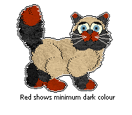 The darker (coldest) areas must be an acceptable colour for that point pattern. Minimum areas for the darker point colour are ear tips, toes/feet, last two tail balls, and the nose/snout, although it can be present on more of the points as well. There is no maximum amount of darker point colour. The rest of the present point colour can be a lighter shade or related colour.