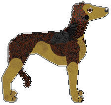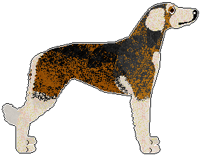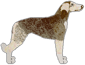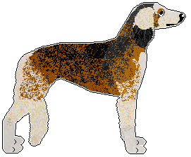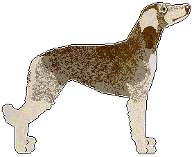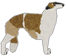 | A grizzled deer domino dog with a standard mask and white in the blanket pattern. (Please note that masking is not accepted in domino Borzois) | A grizzled liver domino dog with white in the irish spotting pattern. A grizzled/tipped furfile is used as a trim between the base/undercoat and the light marking colour | A grizzled black or deer domino dog with white in the irish spotting pattern. A grizzled/tipped furfile is used as a trim between the base/undercoat and the light marking colour |