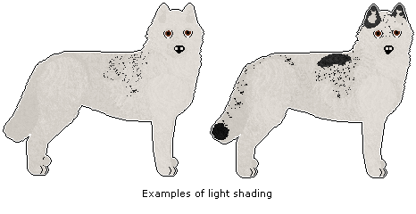 In dogs with Light shading, shading may only be represented as tipping, not solid colour. Exceptions are the ears, tailtip, and as a stripe along the spine, which may be solid in colour.