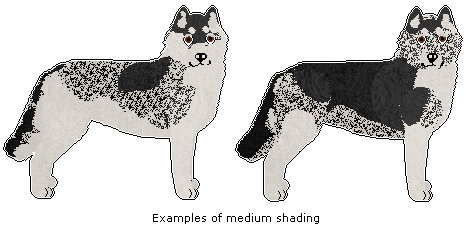 Medium shading is defined as the dog having some degree of shading on the upper body/along the spine, the back of the neck, the top of the head, and the tail. Shading may also be present on the top of the muzzle, the rest of the head (including ears), and the rest of the body (may include shoulders/hips). Shading in all of these area may be represented as solid colour and/or tipping to any degree. As for Light Shaded dogs, the ears and tailtip are always allowed be a solid version of the shading colour.