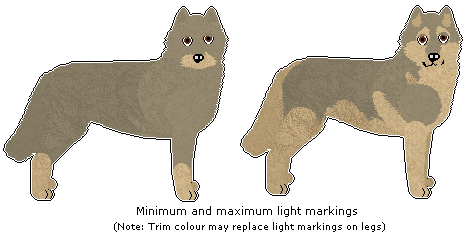 In the patterns where Light Markings are required (Regular and Sooty grizzle), the lower muzzle (jowls, chin, and sides of the muzzle, reaching but not including the cheeks) is the minimum required amount. Toes/fingers and lower legs are also required to be the light marking colour, unless using a Trim colour (see further below).