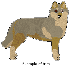 Additionally, Grizzles may show 'trim' (optional). Trim is a secondary marking colour (which is always darker than the primary marking colour), used between the base colour and the light markings. Trim may be used on any area where a Light Marking may be used, and is also allowed to be placed on the ears, the snout, and the backside of the neck.