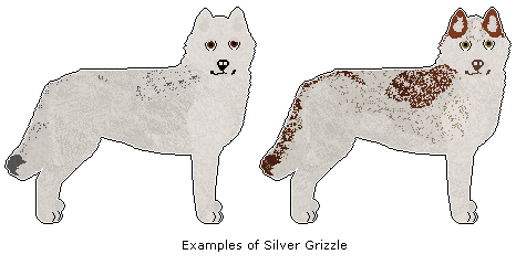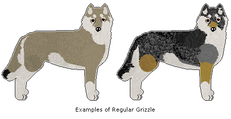 These are the classical 'wolf like' grizzles. Unless otherwise specified in the breed standard, the shading may range from any accepted Light to Dark combination. For Red Grizzle, unless the breed standard lists 'Light' or 'Dark' specifically, both are allowed.