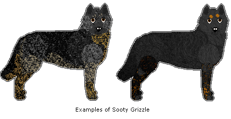 Sooty grizzles are heavily shaded grizzles, ranging from a dog with less defined markings than a regular grizzle to one that appears like a solid shading coloured dog with only faint underlying colour showing through.
