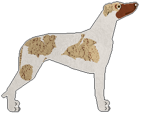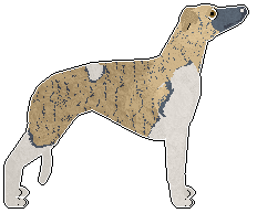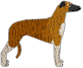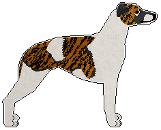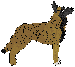 | A liver brindle with white in the piebald pattern and a standard mask in the matching liver pigment | A blue brindle with white in the irish spotting (relaxed) pattern and a standard mask in the matching blue pigment. Also note that this dog features etching - this is where a thin line of the masking colour is present between the white and the coloured areas in masked dogs. Check individual breed standards to see whether this is acceptable for your dog's breed. | A black brindle with white in the piebald pattern and a standard mask in the matching black pigment. Also note that this dog features etching - this is where a thin line of the masking colour is present between the white and the coloured areas in masked dogs. Check individual breed standards to see whether this is acceptable for your dog's breed. |