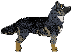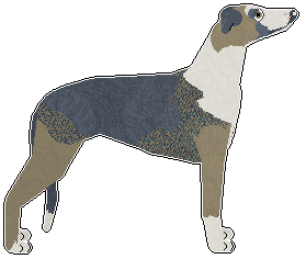| A blue sable dog with shading in the classic pattern, with white in the irish spotting pattern and a standard mask in the matching blue pigment. Pigment spotting is also present on the white of the muzzle. | A blue brindle dog with white in the piebald pattern and a standard mask in the matching blue pigment. Pigment spotting is also present on the white over the entire dog | A black brindle dog with urajiro, white in the trim pattern, and a standard mask in the matching black pigment |